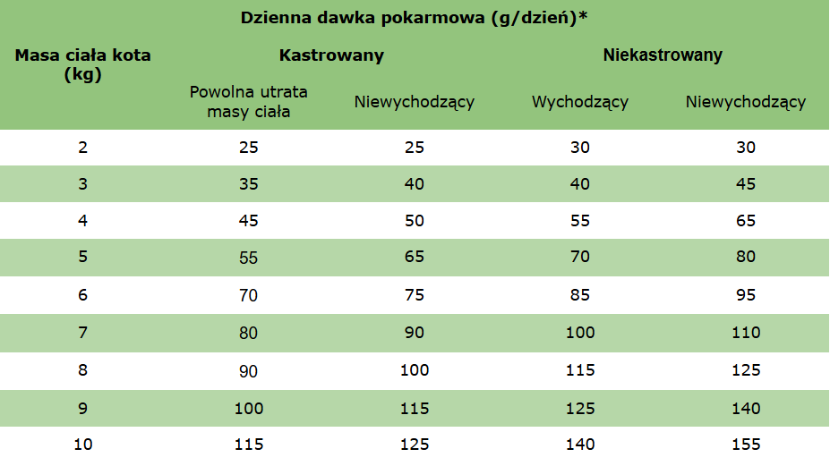 *Podane wartości mają charakter orientacyjny, a dawkowanie może się różnić w zależności od rasy kota.