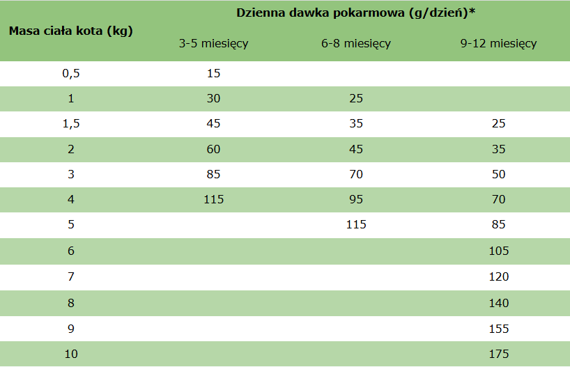 *Podane wartości mają charakter orientacyjny, a dawkowanie może się różnić w zależności od rasy kota. O więcej informacji zapytaj lekarza weterynarii.