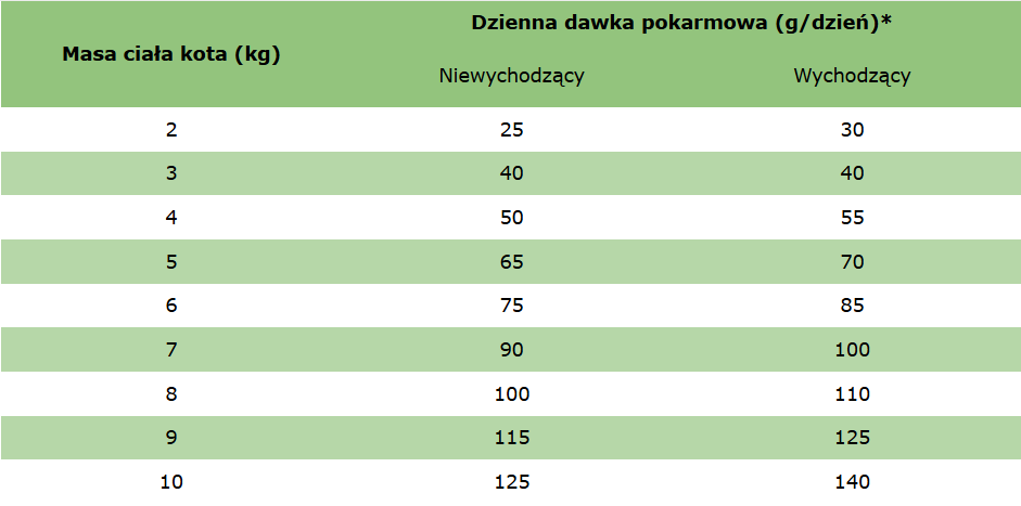 *Podane wartości mają charakter orientacyjny, a dawkowanie może się różnić w zależności od rasy kota. O więcej informacji zapytaj lekarza weterynarii.